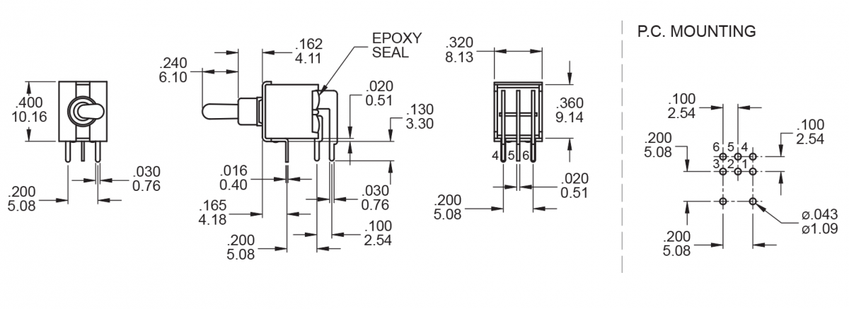 2A Series – Toggle Switches, PCB switches. M6 – DPDT – horizontal – IP67 rated – drawing – RJS ELECTRONICS LTD.