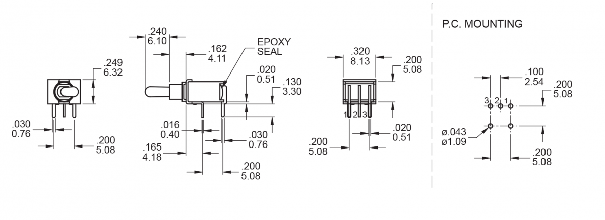 2A Series – Toggle Switches, PCB switches. M6 – SPDT – IP67 rated – drawing – RJS ELECTRONICS LTD.