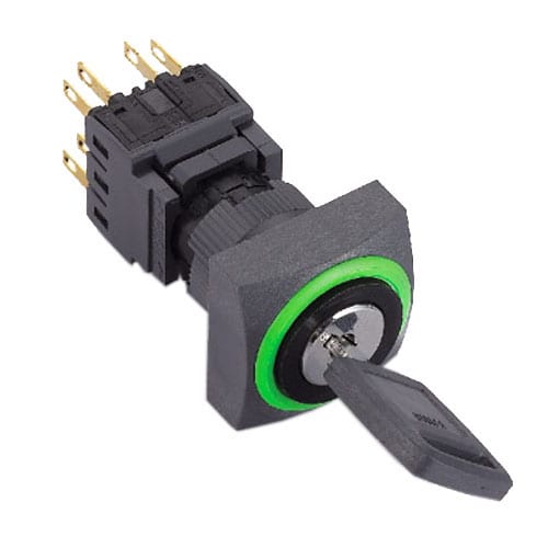 This panel mount Keylock Switch features a square cap and 2 position or 3 position configuration. It is non-illuminated and IP65 rated (from the front). Various ring colour options are available.
