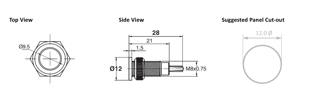 This metal panel mount LED Indicator features a 12mm concave head with LED illumination. It has an IP67 rating (from the front) and a PCB type installation style.
