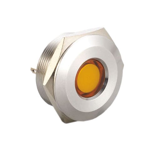 This metal panel mount LED Indicator features a 28mm concave head with LED illumination. It has an IP67 rating (from the front) and a PCB type installation style.