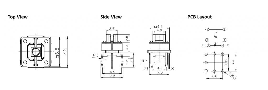 PCB push button with the option for single or bi-colour LED illumination, making it easy to see in any lighting situation. This switch is available with a range of caps to suit your needs, allowing you to easily customise it to match the aesthetics of your project.
